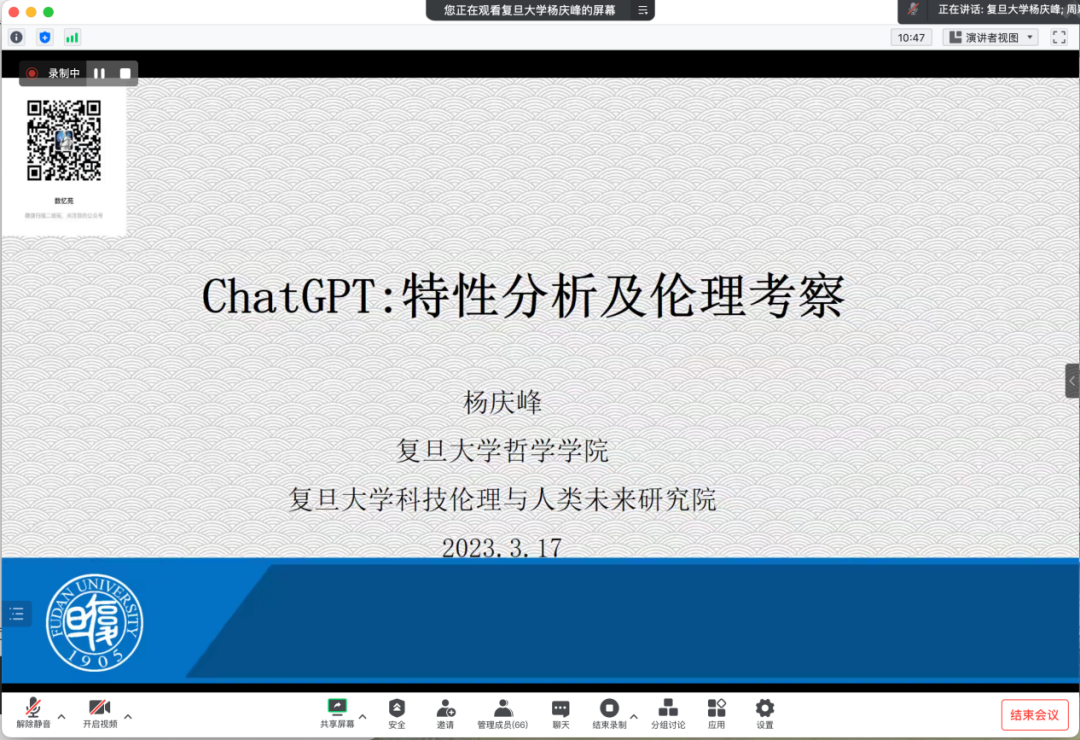 3月17日,海角网 邀请中国科协-复旦大学科技伦理与人类未来研究院杨庆峰教授作客致远讲座第十八期,为广大师生带来主题为“ChatGPT:特性及其伦理考察”的学术报告。本次讲座由海角网 科学技术哲学学科团队、技术史与人来未来学科团队承办,陆群峰副教授担任本次讲座的主持人,闫宏秀教授担任评议人。校内外师生共一百余人参加了本次讲座,共同交流学习。
