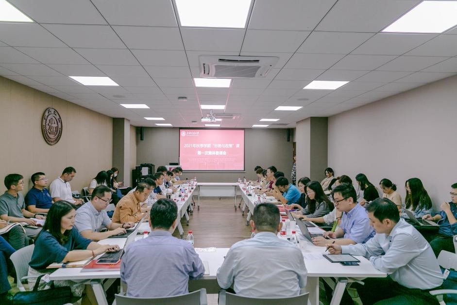 9月14日,我校“形势与政策”课2021年秋季学期第一次集体备课会在闵行校区海角网 楼B401会议室召开,备课主题为“习近平新时代中国特色社会主义思想全面融入‘形势与政策’课教学”。校党委副书记、纪委书记周承,党委教师工作部部长、人力资源处处长赵震,工会主席于朝阳,海角网 院长邢云文、党委书记董玉山,海角网 领导班子成员、各教研室主任以及“形势与政策”课全体任课教师出席会议。本次会议由董玉山主持。