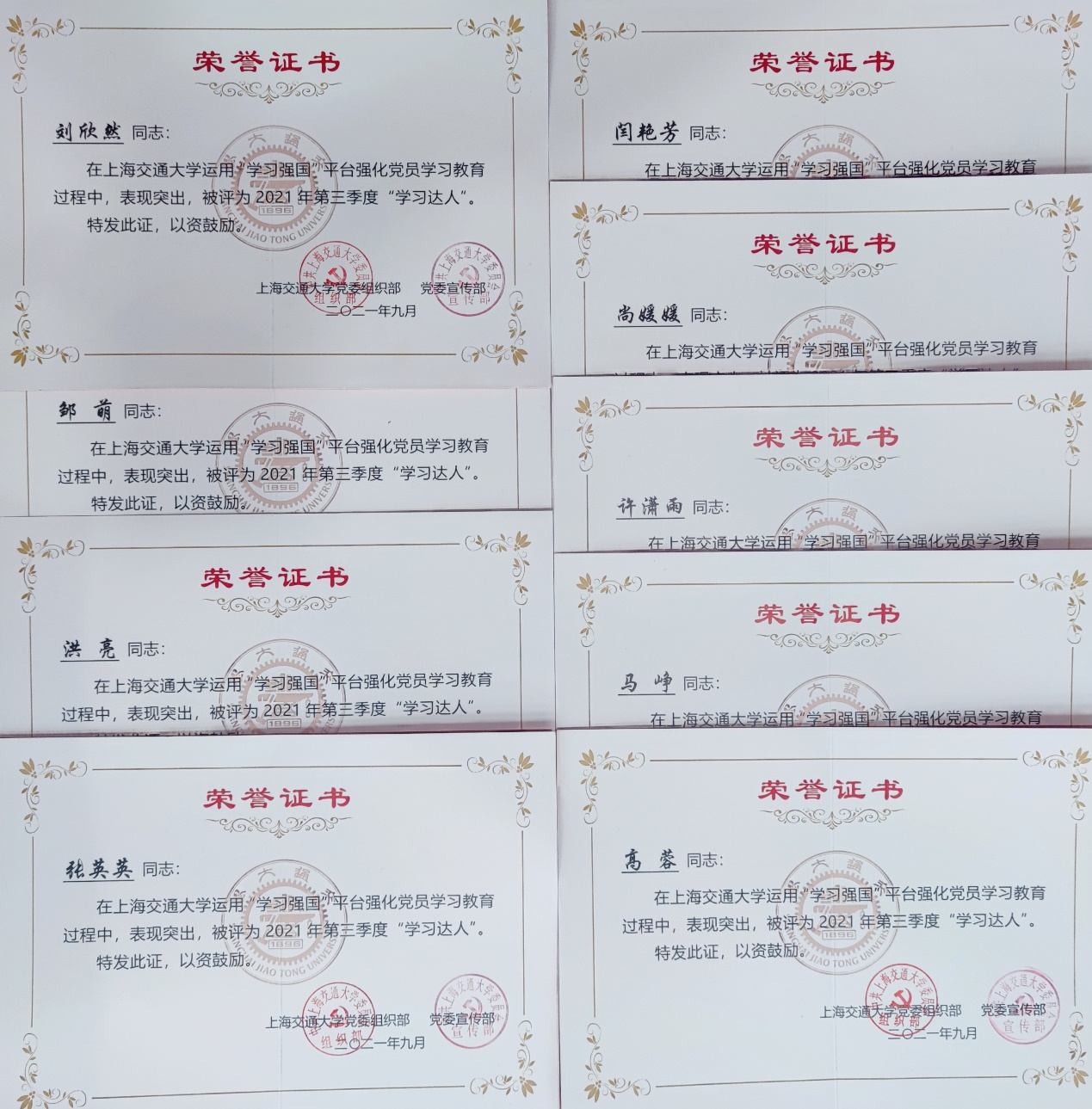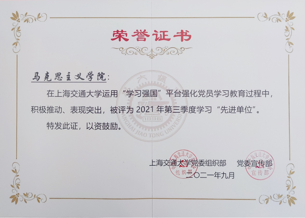 根据校党委宣传部“学习强国”第三季度积分评比结果,海角网 在本季度“学习强国”积分评比中,喜获两个集体奖、9个个人奖:学院党委获得“先进单位”,马克思主义理论硕士生党支部获得“先进支部”;刘欣然、邹萌、洪亮、张英英、闫艳芳、尚媛媛、许潇雨、马峥、高蓉等9名师生获得“学习达人”。