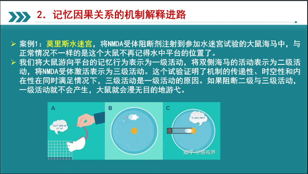 在这一部分,尤洋教授通过莫里斯水迷宫和小鼠恐惧记忆两个案例生动地阐述了记忆因果性能够将低层次的过程(现象)与高层次的过程(现象)联系起来。最新的神经科学技术甚至使用了时间可诱导的靶向转基因和光遗传学技术,这些干预性技术和组合在一定程度上揭示出记忆从分子水平到行为水平的高度特异性的神经机制,精准地确定了记忆机制的因果关系。尤洋教授指出,有理由认为,以机制为导向的记忆因果关系解释具备更强的理论优势。