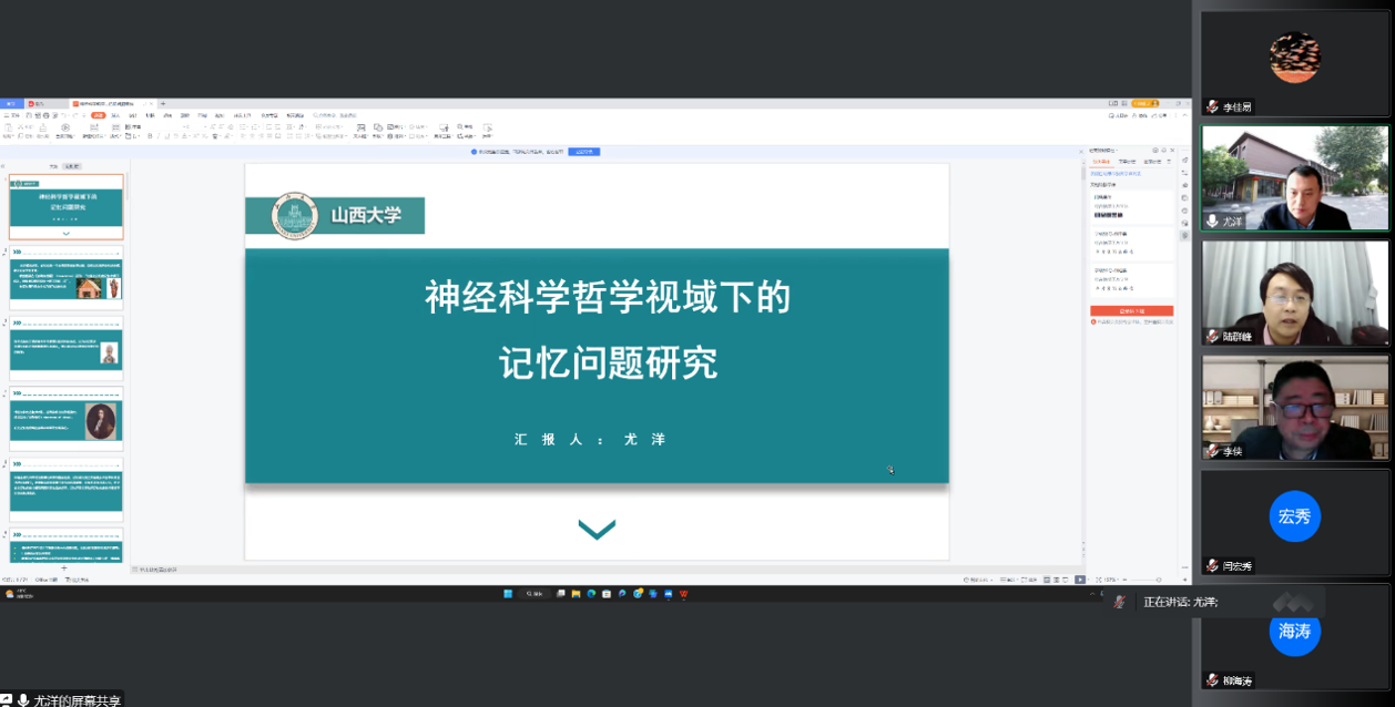 随后,尤洋教授进行了小结。他认为,随着传统记忆因果理论的逐步衰落,当代记忆的因果性研究更多地聚焦于机制解释的新视域之内,神经科学的方法论特征逐步渗透在以因果性为代表的记忆问题研究中,由此呈现出实在的以及颅内主义的神经科学哲学解释,这一研究进路不但能有效的规避记忆因果关系的偶然性,而且有助于建构出一条从现象到机制的新路径,对于破解“记忆虚幻”、探索包括大脑、行为和意识在内的记忆连接之谜,具有重要的研究意义和价值。