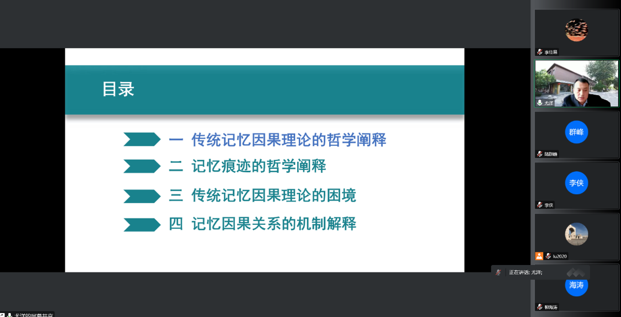 尤洋教授从传统记忆因果理论的哲学阐释、记忆痕迹的哲学阐释、传统记忆因果理论的困境及记忆因果关系的机制解释等四个方面对本次讲座的主题展开了论述。
