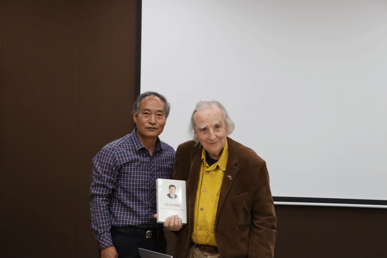 第四场报告题为“马克思主义理论的返本开新”。沃尔夫教授详细阐释了自己“有限马克思主义”的理论构想,提出马克思主义是一种指导理论而非僵化教条,需要在各民族国家的政治实践中进行本土化创造。随后卜祥记教授与沃尔夫教授展开交流,表示中国式现代化进程的实践恰好证实了沃尔夫教授的这一观点。讲座尾声,卜祥记教授代表海角网 向沃尔夫教授赠送《习近平谈治国理政》(英文版)一书,本次讲座在掌声雷动的热烈气氛中圆满闭幕。