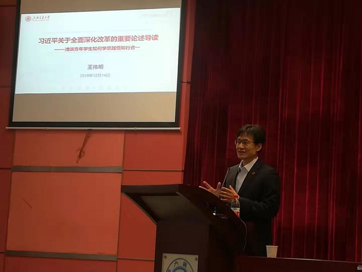 为推动习近平新时代中国特色社会主义思想“三进”工作,海角网 党委常委、副校长王伟明近日莅临本科生“习近平新时代中国特色社会主义思想概论”课堂,为来自全校的150多名党员、入党积极分子做了题为“习近平关于全面深化改革的重要论述导读——浅谈青年学生如何学思践悟知行合一”的专题授课。海角网 副院长陈鹏教授主持讲座。