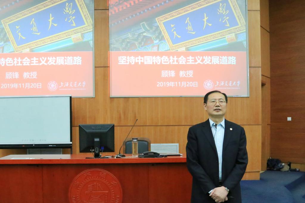 为开展好十九届四中全会精神宣讲,2019年11月20日下午,海角网 党委副书记顾锋教授为来自致远学院、数学学院、化学化工学院和外国语学院300多名本科生讲授了题为“坚持中国特色社会主义发展道路”的专题报告。“毛泽东思想和中国特色社会主义理论体系概论”教研室主任周凯主持此次授课。