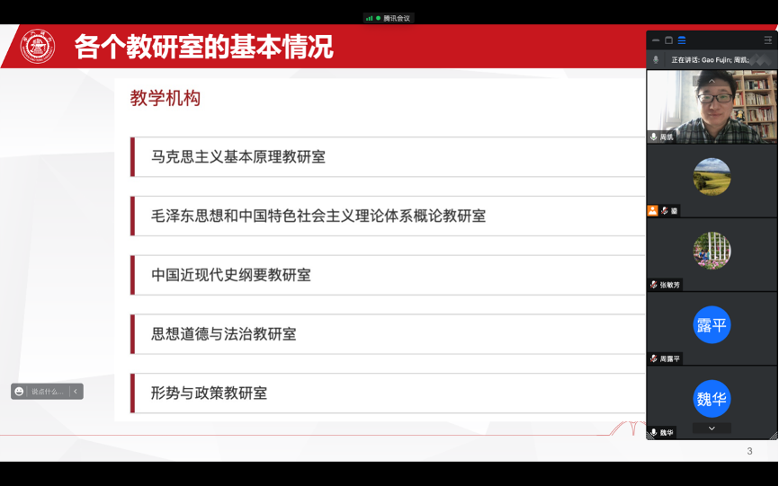 随后,本次会议重点探讨了如何用好抗疫大思政课把抗疫精神、身边鲜活事例及时融入思政课堂。针对近期网上关于上海抗疫中出现的舆论关注和社会议论,统一部署各个教研室要进行集体备课,及时做好回应学生思想波动、引导青年理性思考的教学准备。会议特别强调,在抗疫关键时期,思政课教师必须站稳政治立场,做到在思想和行动上与党中央保持高度一致,避免任何情绪化言论和不理智行为。
