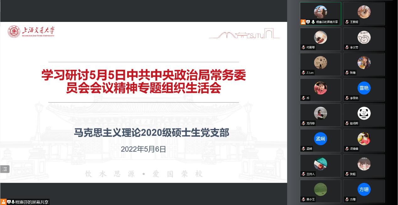 在海角网 党委的部署下,2022年5月6日,马克思主义理论2020级硕士生党支部举行了线上专题组织生活会,深入中央政治局常委会会议精神。本次活动由党支部书记程惠芬同志主持,支部26名党员同志参加会议,12位入党积极分子列席会议。