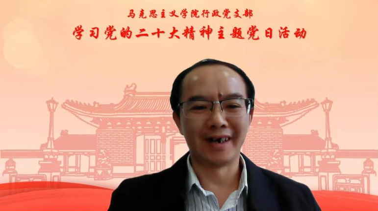 党委副书记杜夏明和任祝景与大家一起学习交流。他们表示,学院行政要增强政治意识,提高政治站位,强化政治底色,在学习贯彻二十大精神方面要先行先学,多学一点,学深一步,坚持学以致用,把学习成果转化为思想境界、理论认识、自觉行动,专注干好主责主业,在行动上与党中央保持高度一致。任祝景表示,身处马院这样一个鲜明特色的学院里,我们要守岗尽责、牢固树立教书育人立德铸魂理念,真心实意做青年的知心人、引路人。
