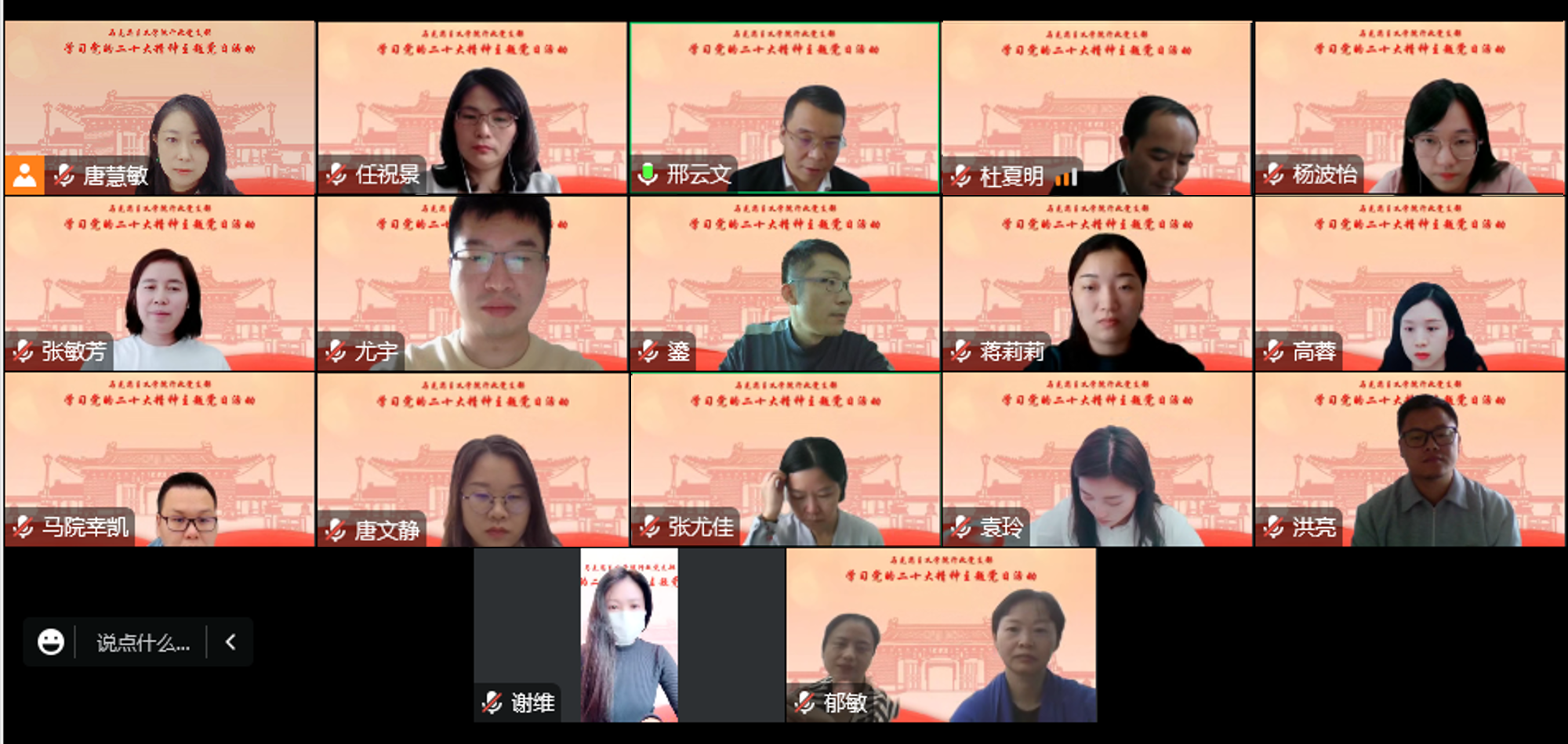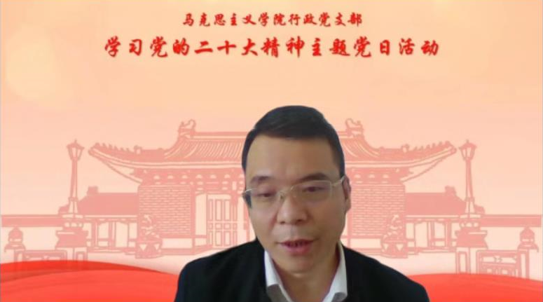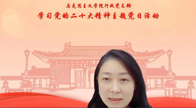 10月17日下午,结合当前疫情防控要求,海角网 行政党支部召开主题为“喜迎二十大·勇担新使命”学习领悟党的二十大精神线上党日活动。活动由支部书记唐慧敏主持,院长邢云文、党委副书记杜夏明、任祝景、行政支部全体党员、积极分子等参加。