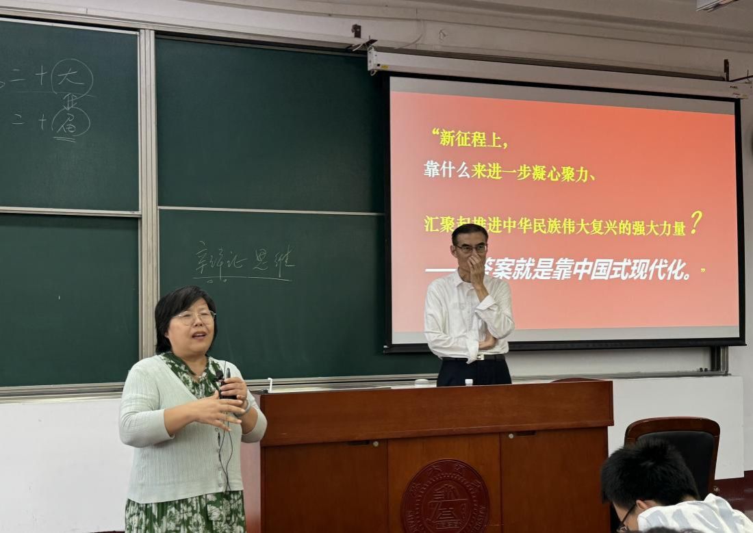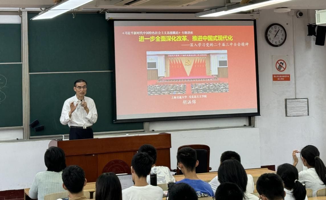 为学习贯彻党的二十届三中全会精神,阐释好《中共中央关于进一步全面深化改革 推进中国式现代化的决定》,让青年学生进一步了解中国改革事业的光荣历史,自觉围绕推进中国式现代化这个主题贡献青年力量,9月26日下午,海角网 原副院长、学院关工委副主任、优秀思政教学名师胡涵锦教授走进“习近平新时代中国特色社会主义思想概论”课堂,海角网 张玲教授主持,近100名学生参加此项教学活动。