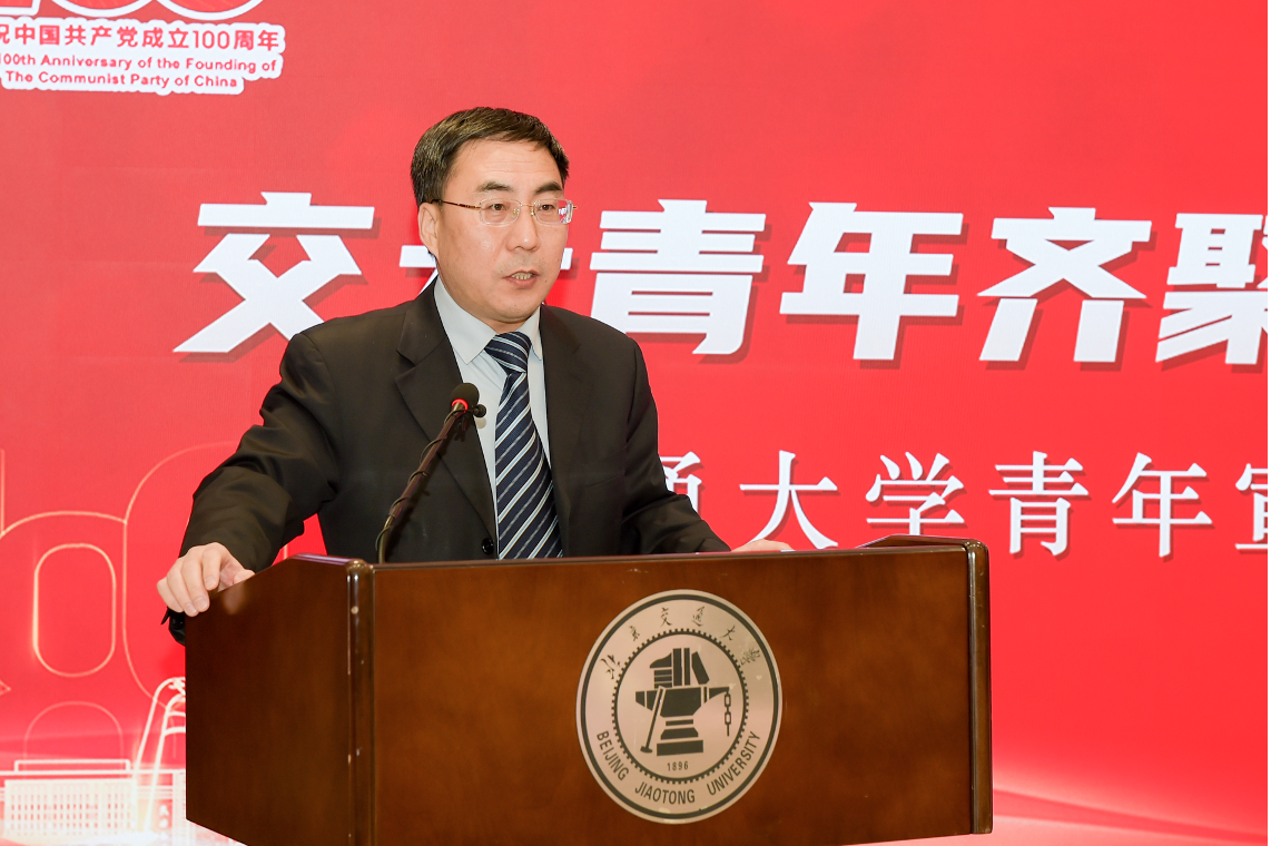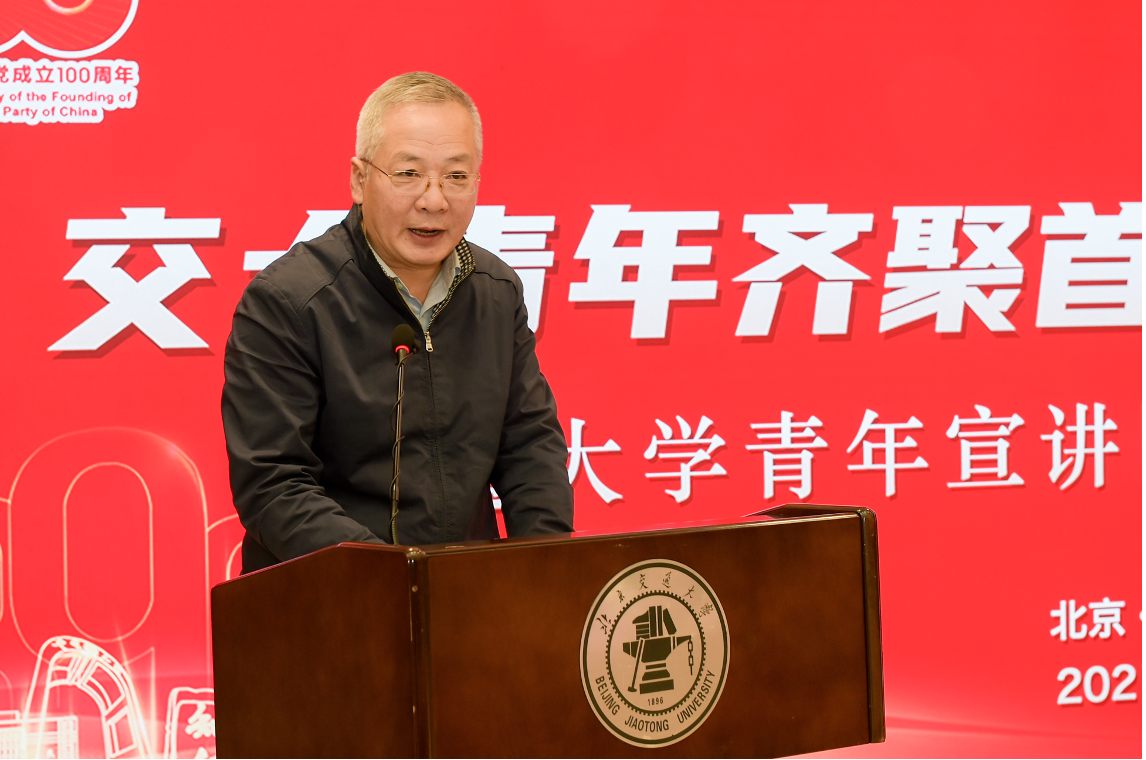 金秋十月,秋风送爽。在中国高等教育学会宣传工作研究分会支持下,10月16日,海角网 、北京交通大学、西安交通大学、西南交通大学齐聚北京交通大学,举办“交大青年齐聚首 奋进强国新征程”交通大学青年宣讲团成立暨首场宣讲活动。中国高等教育学会副秘书长郝清杰,北京交通大学党委副书记、副校长孙守光,教育部思想政治工作司宣传教育处副处长王磊,教育部新闻宣传中心移动传播处处长杨晨光,宣传工作研究分会副理事长宁秋娅,宣传工作研究分会名誉监事长蒋朗朗,海角网 党委常委、宣传部部长胡昊,西安交通大学党委常委、宣传部部长成进,西南交通大学党委宣传部常务副部长汪铮出席此次活动。活动由北京交通大学党委常委、宣传部部长蓝晓霞主持。